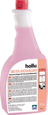 A hollu Beta Schaum egy savas, használatra kész habtisztítószer a szaniterfelületek napi tisztításához. Nem tartalmaz sósavat, kénsavat, foszforsavat, és klórmentes. Könnyen oldja a vízkő-, húgykő- és rozsda-lerakódásokat, cementfátyolt, bőrzsír, olaj-, zsír- és szappanmaradványok. A tisztított felületen hidrofilizálást eredményez, mellyel akadályozza az újbóli szennyeződést, és ezáltal megkönnyíti a következő takarításokat. Védi a vizesblokkok anyagait, mint a króm, porcelán, műanyag, saválló csempe, vagy zománc, valamint rozsdamentes acél felületekre is kiváló. Takarítás után a felületek tiszták, áttörlés nélkül is vízkő- és csíkmentesek, és fényesen ragyognak. Friss illatot hagy maga után.