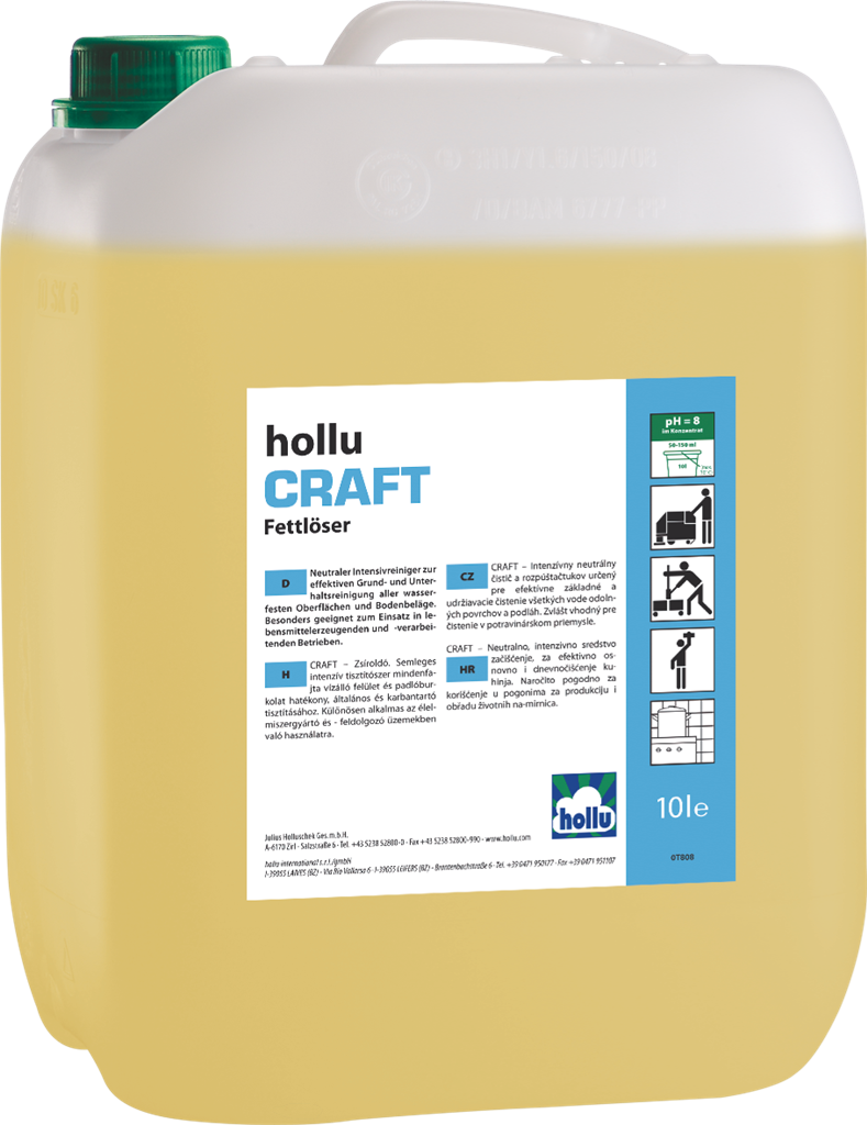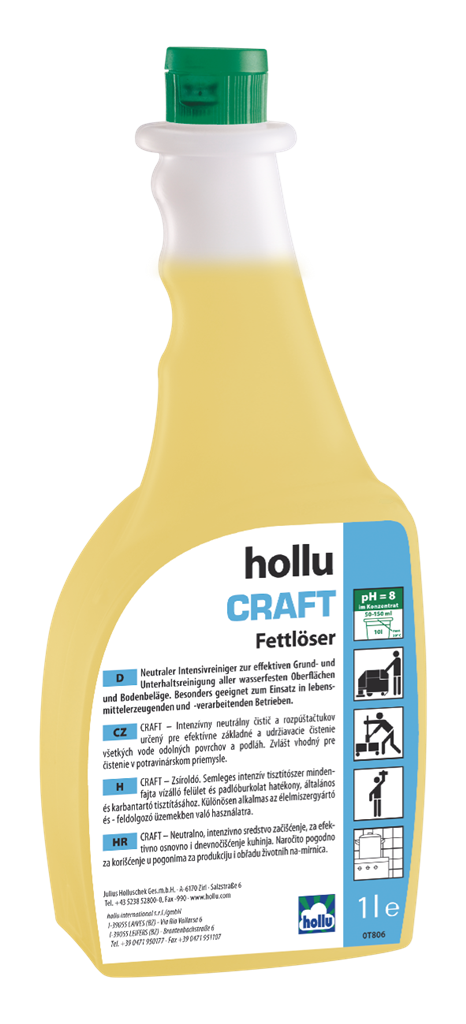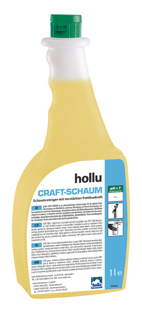 A hollu Craft Schaum semleges, használatra kész habtisztítószer a felületek napi tisztításához. Különösen kiváló a zsíros szennyeződések eltávolítására, például konyhai területeken. Oldja a lerakódásokat, mint pl. olajos- és zsíros szennyeződések, légszennyeződések lerakódásai, nikotin stb. Alaposan, mégis kíméletesen tisztít a semleges kémhatásnak köszönhetően. A tisztított felületen hidrofilizálást eredményez, mellyel akadályozza az újbóli szennyeződést, és ez által megkönnyíti a következő takarításokat. A területen friss illatot biztosít. Használata után a felületek tiszták, áttörlés nélkül is csíkmentesek és fényesen ragyognak.