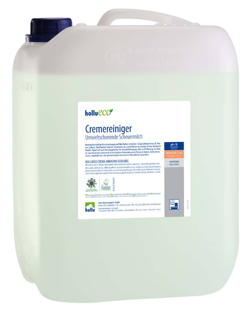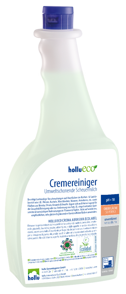 A hollueco Cremereiniger különösen intenzív tisztítóhatású súrolótej finom szemcsékkel, valamennyi kemény felületre a konyhában és a vizes blokkokban. Segítségével könnyen eltávolíthatóak a zsír- és olajszennyeződések, valamint az edényekből a rászáradt vagy odaégett ételmaradványok. Kerámia főzőlapokra is kitűnő. Kiváló ökológiai tulajdonságai miatt elnyerte az osztrák és az európai öko jelölés használati jogát, és pozitívan szerepel a nyilvántartásokban.