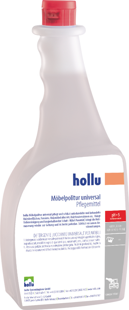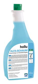 A hollu Alfa Schaum egy használatra kész tisztítószer napi felülettisztításhoz. Oldja a bőrzsírt, olajos- és zsíros szennyeződéseket, légszennyeződéseket stb. Alaposan, ugyanakkor kímélően tisztíthatóak vele a műanyag felületek, mint dekorlapok, PVC, plexi, ABS stb. A használatra kész készítmény lehetővé teszi az időtakarékos tisztítást, mivel a hígításra nem kell időt fordítani. Az alkalmazási területen friss illatot biztosít, és a tisztított felületen hidrofilizálást eredményez. Ezzel akadályozza az újra szennyeződést és ezáltal megkönnyíti a következő takarítást. "Anti-ujjlenyomat" hatású a dekorlap felületeken! Takarítás után a felületek tiszták, csíkmentesek és fényesen ragyognak.