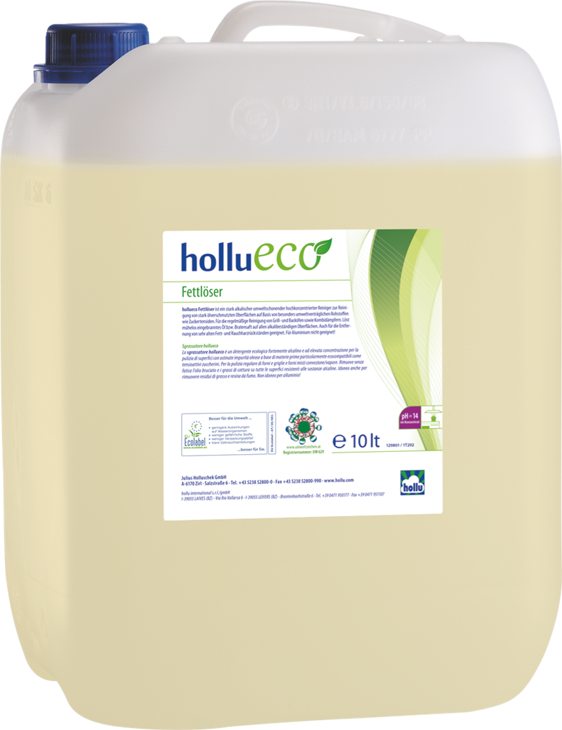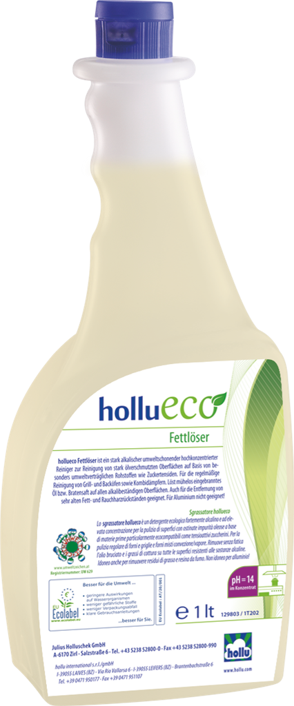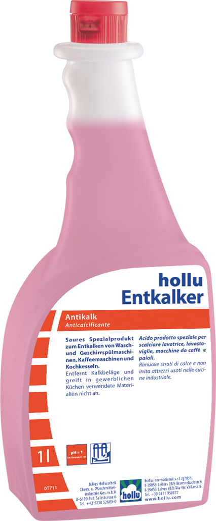A hollu Entkalker egy speciális vízkőoldó, mosógépek, mosogatógépek, kávégépek és főzőedények vízkőmentesítéséhez. A termék eltávolítja a vízkőlerakódást a mosó- és mosogatógépekből, főzőedényekről, üvegfelületekről, csempéről, stb., illetve a mosott ruhákon megtapadt vízkövet is oldja. Nem marja meg a tűzzománcot, nemesacélt valamint a műanyag több fajtáját. Alumíniumon, színesfémen vagy azok ötvözetén, nem saválló műanyagon vagy csempefugán csak előzetes próba után szabad használni! A hollu Entkalker hígított foszforsavat tartalmaz.