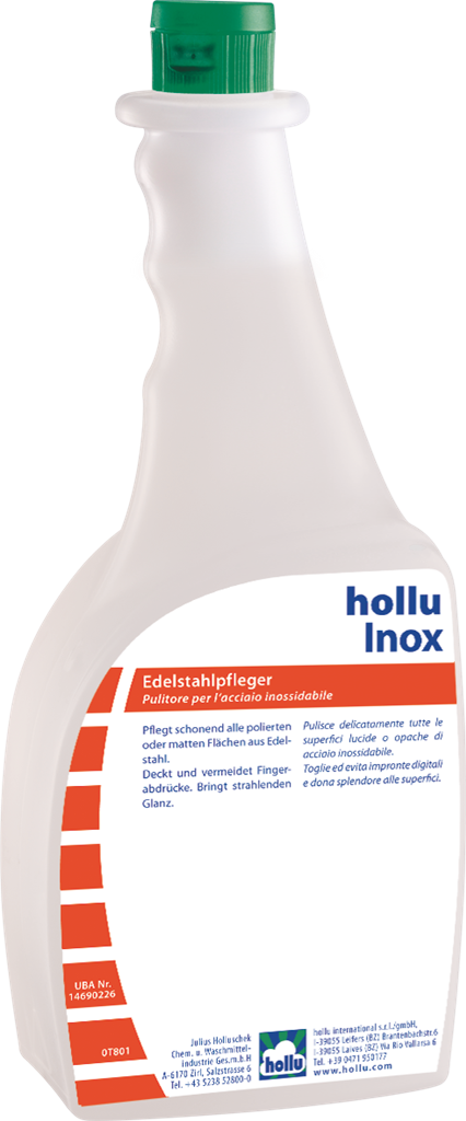 A hollu Inox folyékony nemesacél-ápolószer kíméletesen ápol minden polírozott és matt nemesacél felületet. Megelőzi az ujjlenyomatok kialakulását. Tündöklő ragyogást eredményez. Nem károsítja a nemesacélt, vagy más fémeket. Speciális olajakat tartalmaz, melyek kiválóan ápolják a nemesacél felületeket. A termék egy hajszálvékony bevonatot képez a fémen, amelynek köszönhetően a felület fényesen ragyog.